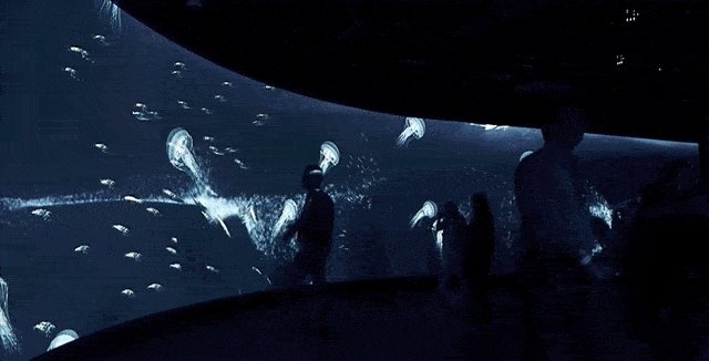 沉浸式海灣溪流體驗(yàn)使用專門開發(fā)的計(jì)算機(jī)算法來展示成千上萬的虛擬沙丁魚和其他海洋生物的現(xiàn)實(shí)和不斷變化的教育行為。借助攝像頭跟蹤傳感器,使參觀者可以實(shí)時(shí)影響超高清流動(dòng)環(huán)境,這類似于游獵或水肺潛水。