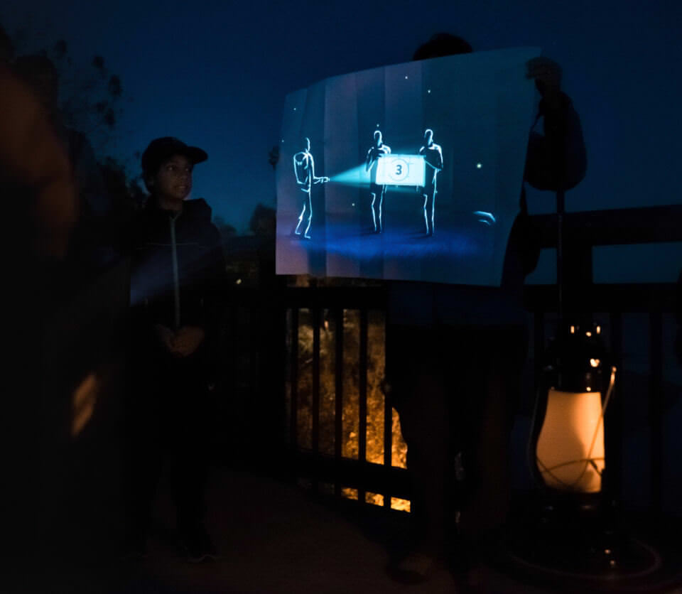 到達現場后,在每個小組中分發了一個特制的工具包。每個套件都包括偽裝成Parks Canada裝備的各種類型的手持多媒體設備:地圖,燈籠,手電筒,背包等。小組使用他們的工具包一起探索公園。得益于無線可部署系統,該操作十分安全,該系統可自動打開和關閉工具,觸發視頻內容,特殊效果,音樂和語音。通過在公園中不同地點獨特激活的工具,參與者可以共同協作,發掘多媒體發現時刻。從在Rouge河上游游的鮭魚到Minnewanka湖淹沒的小鎮,每一個瞬間都是該工具包創建的多媒體效果的結合。