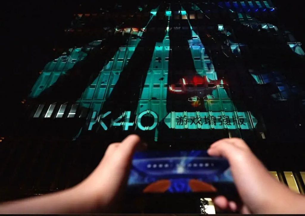 不僅如此,大樓前面也設有專門給觀眾進行體驗的站臺,站臺中放有本次的主角Redmi K40游戲版手機,觀眾可以通過手機進行操作,對樓體投影進行一些變化,體驗下用手機操控小米大樓的感覺。