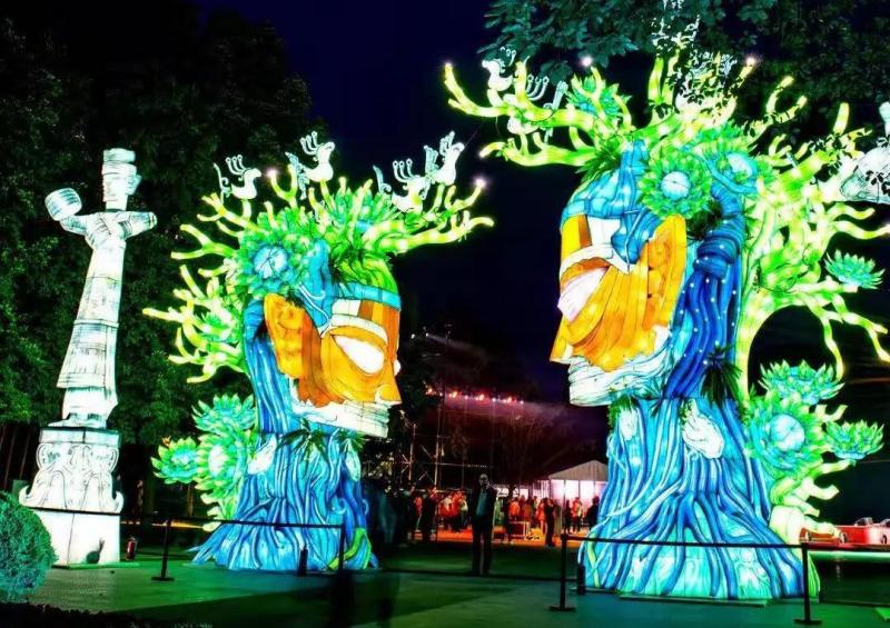 “三星堆奇妙夜”夜游活動可分為“幻境三星堆”、“聆聽三星堆”、“詩意三星堆”、“霓裳三星堆”、“奇遇三星堆”五個部分,首先體驗的是“幻境三星堆”,該部分以三星堆的著名歷史文物為主題,把自貢燈彩澆筑在黃金面具和太陽玄鳥鑄成夢幻的青銅神樹,讓游客在光影之中夢回千年前的古蜀。