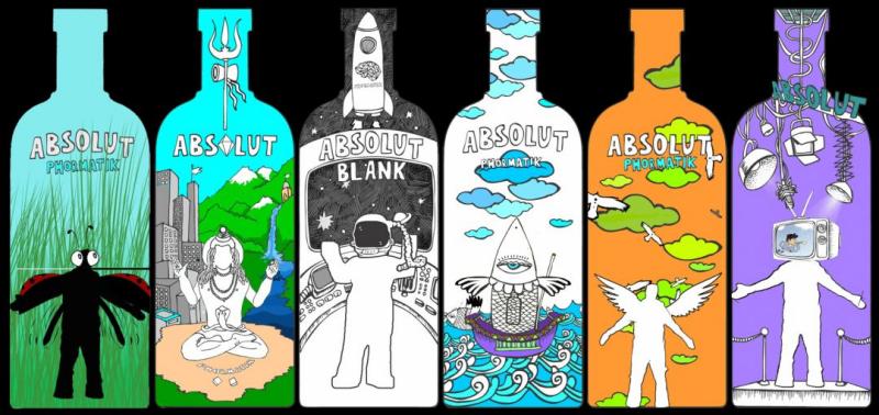 團隊以經典的酒瓶為基礎,在純白的帆布上創作。包裝從簡單、透明轉變為色彩與線條交織、圖案與故事并存的各色奇異的形態。