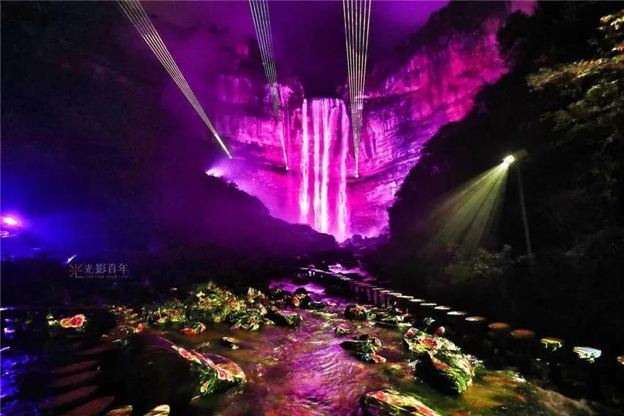 我們團隊立足于整案策劃規劃基礎上,以當地重要歷史文化為背景,“千瀑之鄉”5A級景區四面山為舞臺,“中國十大愛情故事——愛情天梯”為脈絡。借助數字多媒體創意,設計故事動線1.4公里,沿線分13個故事節點,設置24處科技光影應用與互動藝術裝置。打造出“動靜結合、虛實結合、情景結合”一景一故事的行走探險式數字創意沉浸式體驗。