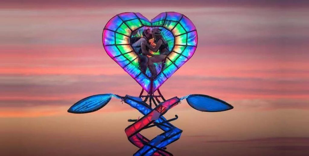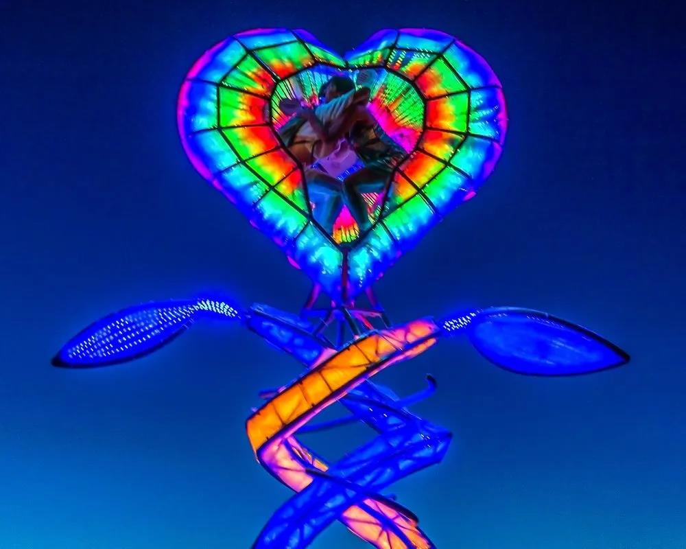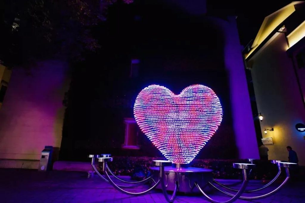 這是一個20英尺的雕塑裝置,雕塑中創造了一個戀愛空間,夜晚還會亮燈,非常絢麗,通過這個很溫暖藝術裝置,希望讓大家珍惜找到的幸福。在這里,會有有許多情侶游客在藝術裝置里面合影求愛,時不時會驚現各種浪漫的場景。