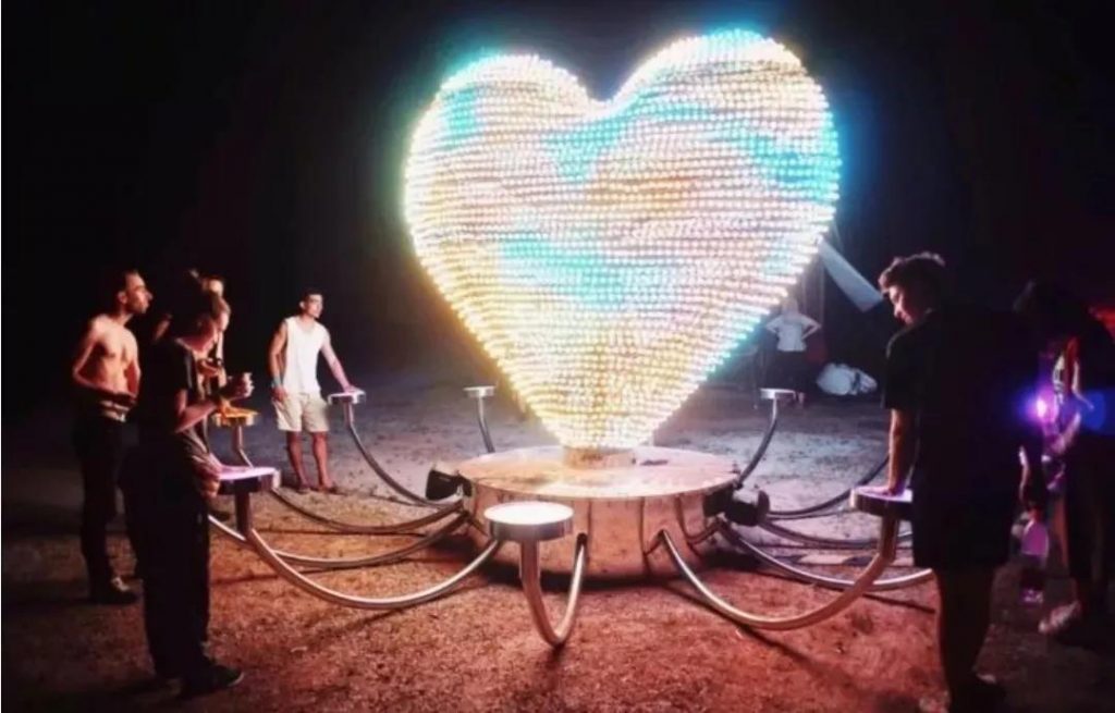 這款《和諧的心跳》互動燈光藝術裝置由法國新媒體藝術家組合LLND打造。這個超過5米的巨大心臟形裝置,環繞四周編排了觸控LED顯示器,內置心跳傳感器,可以監測心率。