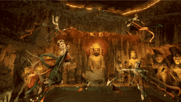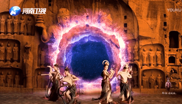 通過數字創意科技進行了數字化掃描,運用AR技術加入科技感包裝,把佛像和場景三維化,重新搭建起了龍門石窟的場景,同時對佛像的一些殘缺部位,進行了復原和染色處理,努力展現幾百年前甚至更遠時間,再現龍門石窟輝煌壯麗的場景。