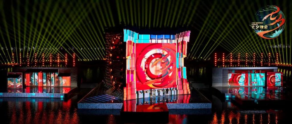 2021年央視七夕晚會,是在孕育了牛郎織女傳說的西安昆明池七夕公園錄制。夜幕下,天為幕,水為臺,將AR、kinect實時動捕、新媒體互動裝置等數字創意與節目融合,在寓意“天圓地方”古樸哲學觀念的數字創意舞臺造型上,運用國漫、國潮元素打造呈現中國人特有的浪漫文化。