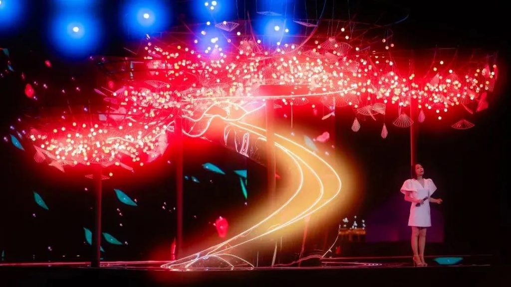 晚會上,這個新媒體互動裝置作為舞臺“常駐”,貫穿整場演出。裝置整體呈現選擇了“古樹”造型,通過“讓愛發聲”的互動形式,表達中國人對于七夕傳統節日的真摯熱愛,讓新媒體藝術與數字舞臺藝術相輔相成。