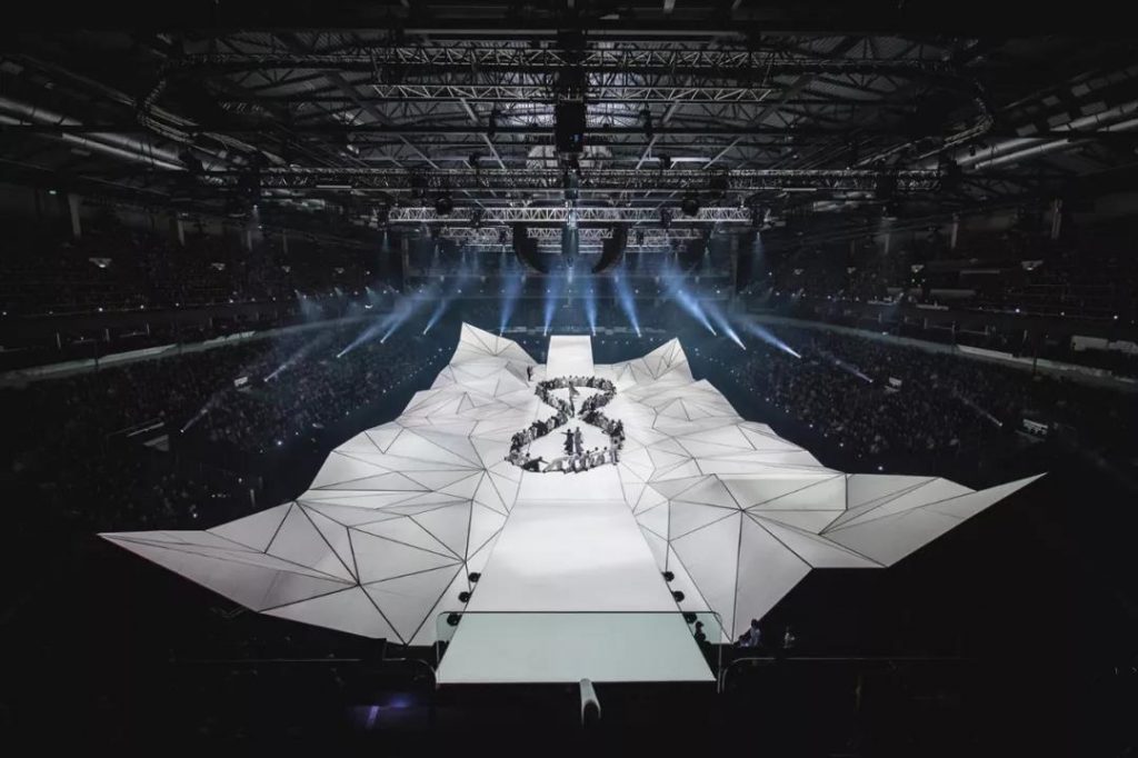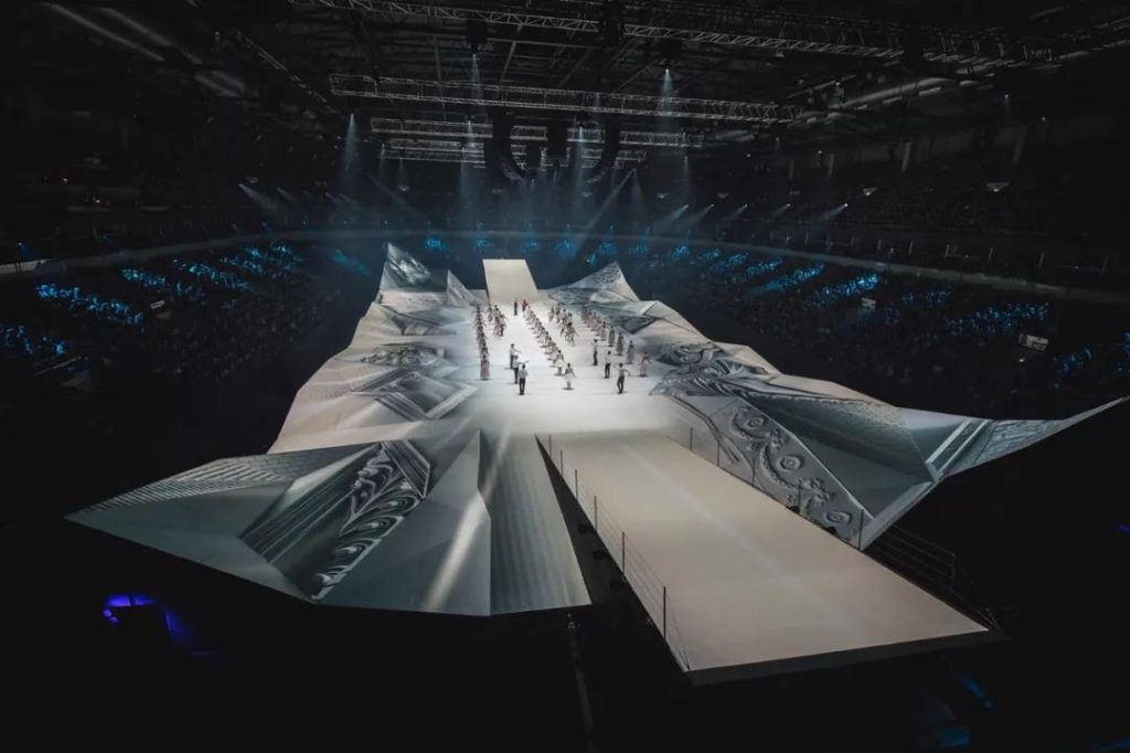 舞臺和觀眾區域都為了配合主視覺效果,設計著碎片化的裝置造型。主屏幕由3個可折疊數字框架與相對應的LED組成。與全場碎片裝飾互相映襯,形成“時尚、科技、未來”的視覺效果沖擊。