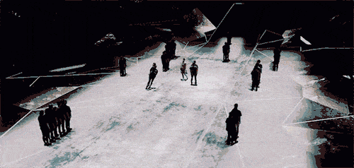 數字舞臺整體感覺充滿科技感的碎片炫酷效果,共由背景處巨型舞臺、中央立方體舞臺、觀眾區的“田”字舞臺組成。每個區域都裝飾著不同的舞美機械裝置。