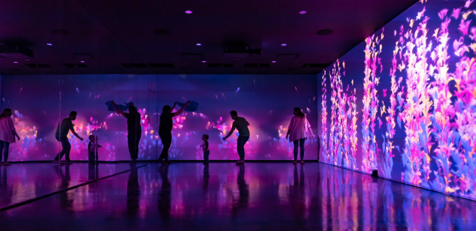 游客將沉浸在一個包羅萬象且舒緩的多媒體環境中。他們通過簡單的手勢與生成的內容互動,成為移動小枝的微風,互動墻讓他們可以玩耍并與花朵互動——撿起、扔掉它們,甚至在花瓣雨下旋轉。這些使用視頻游戲軟件創建的交互式和直觀的視覺效果吸引了游客,并且可以通過模擬自己開花的動畫在社交媒體上分享自己的體驗。