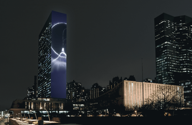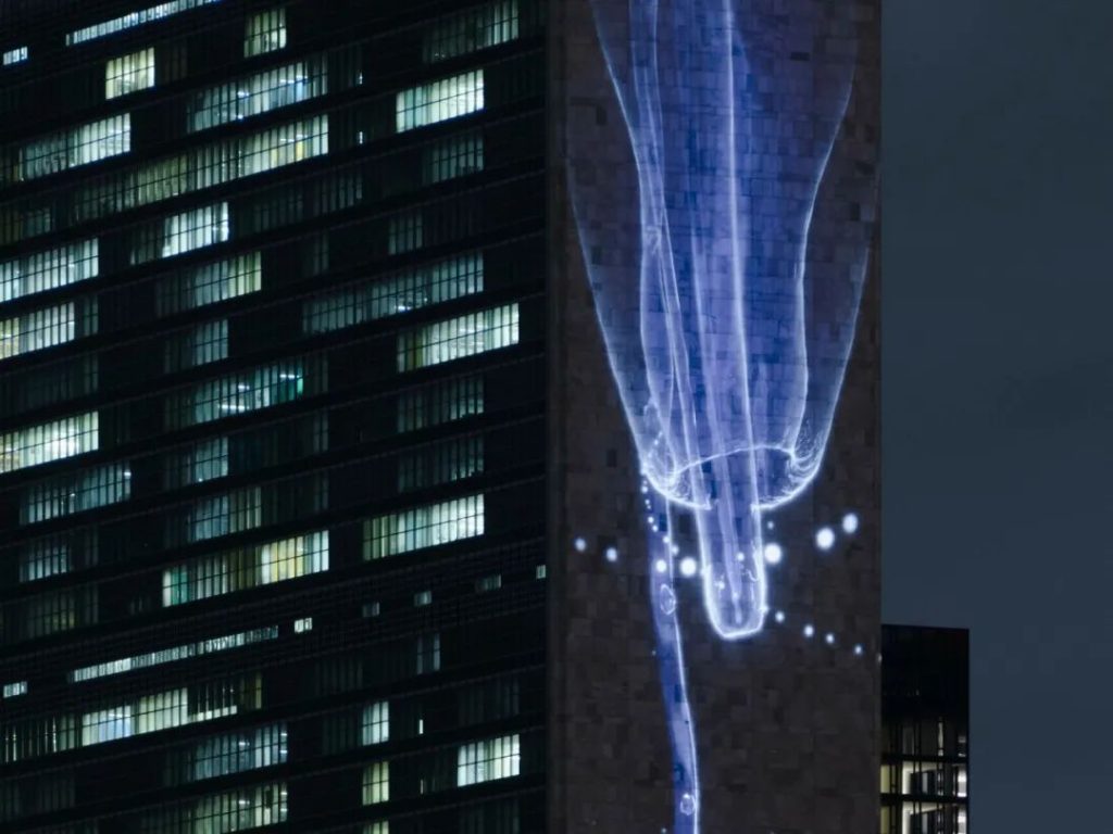 9月21日至24日來(lái)自丹麥的藝術(shù)小組SUPERFLEX,在聯(lián)合國(guó)總部大樓外立面上播放視頻投影《垂直遷移》(Vertical Migration,2021),把海洋中的管水母搬到了空中閣樓,這段20分鐘的視頻以145米高的投影形式出現(xiàn)在建筑北面的玻璃幕墻上,通過(guò)循環(huán)播放,呼吁人們關(guān)注氣候問(wèn)題。