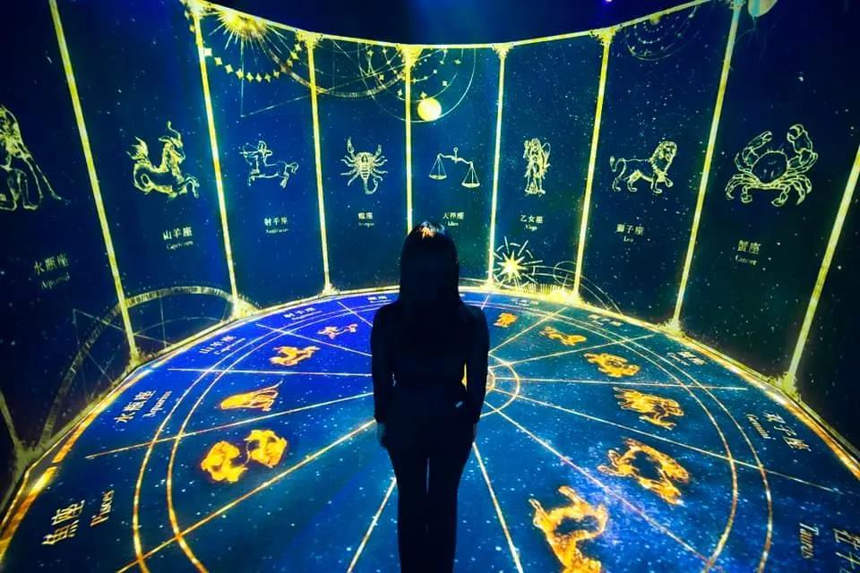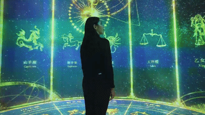 接下來就來到占卜環節了,作品HOROSCOPE是一個關于12星座的360°沉浸式空間,駐足在新媒體藝術空間中,你將感受夢幻的星座變化,宇宙的絢爛,感受塵封于自己身體中的星座物語,將自己的靈魂融入到十二宮圖中,與自己的本質面對面。