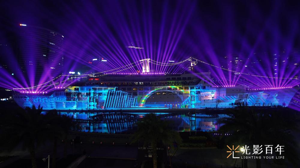 中國第一座綜合性的海上旅游中心明華輪,這是革開放的重要標(biāo)志之一,170米的明華輪身上,上演深圳改革開放40年來的波瀾壯闊與未來暢想的奇幻3D光影秀,這是國內(nèi)首創(chuàng)170米超大型輪船體3DMapping燈光光影秀。