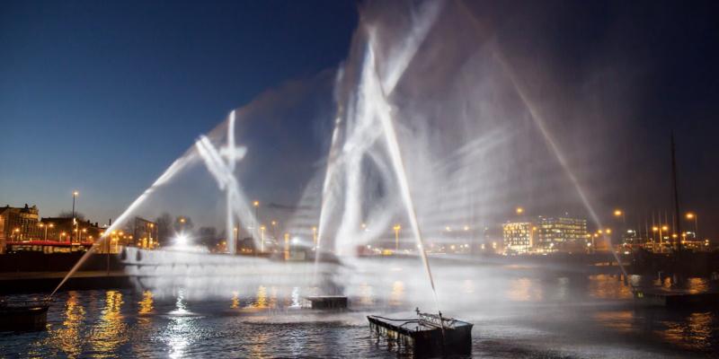 《Ghost Ship》?:該作品是通過水幕全息投影形成的一艘幽靈船,通過水幕若影若現的視覺感受,以及風的吹動影響畫面的微動,讓投影出來的幽靈船更添一抹神秘。