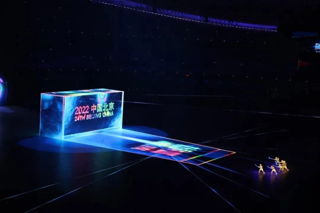 奧運五環的呈現,一直是最能體現開幕式的構思與靈感的,本次開幕式由一個冰球撞向“冰立方”,冰立方逐漸破碎為開始,隨即往屆23屆冬奧舉辦城市的歷史隨著環繞全場的24道“激光刻刀”的雕琢閃回其上,隨即,一個晶瑩剔透的冰五環從冰立方當中破繭而出。據了解,該冰立方總重量有400噸,升降重量達180噸,利用特效的光影實現破冰而出的效果。