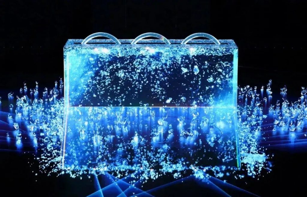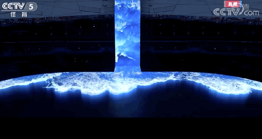 這是一塊將近60米高、20米寬的LED屏,這塊屏幕傾刻間化身為一道連接天地的藍色瀑布,當一滴冰藍色的水墨從天而降,又瞬間化開變為黃河之水,傾瀉而下,整個場地波濤翻滾,讓人不禁想到李白的“黃河之水天上來,奔流到海不復回”讓全世界看到我們的文化底蘊,翻涌的海浪最終流動并凝結為一塊冰立方:2022中國北京。