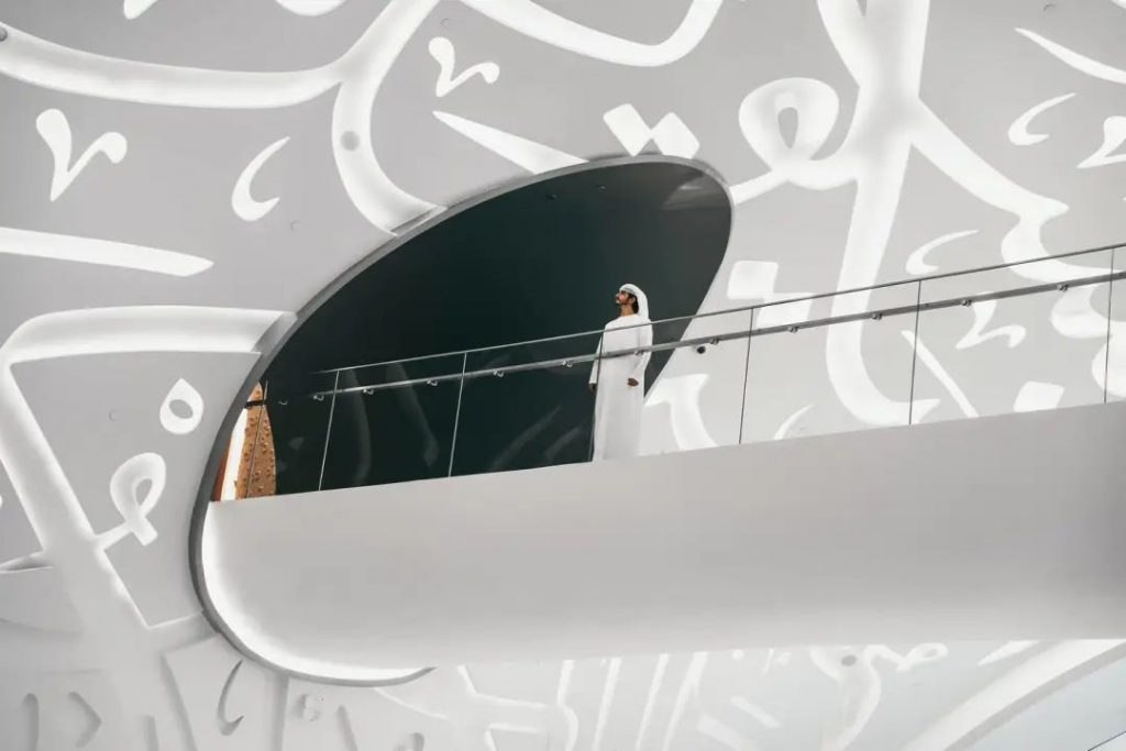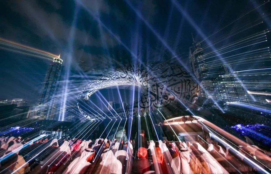 整個(gè)場(chǎng)館的外立面由在機(jī)器人輔助,結(jié)合3D 打印技術(shù)建設(shè)完成,外觀均是曲面,由 1024 多個(gè)寬度最大3米,高度9米單獨(dú)的阻燃復(fù)合板無(wú)縫組成,錯(cuò)綜復(fù)雜的阿拉伯文字詩(shī)歌被印在建筑表層,表達(dá)了對(duì)未來(lái)發(fā)展的美好愿景,整博物館由三部分組成:環(huán)形建筑、鏤空部分、綠色山丘;分別代表了人類、未來(lái)和生物的多樣性,形狀各異而不重復(fù)的面板上覆蓋著約七千塊玻璃可以保證室內(nèi)白天的光線充足,晚上這些窗口隱藏著14公里的LED燈將會(huì)點(diǎn)亮這個(gè)城市。