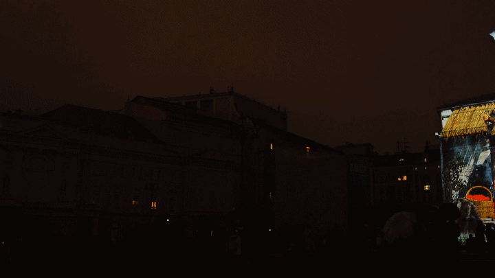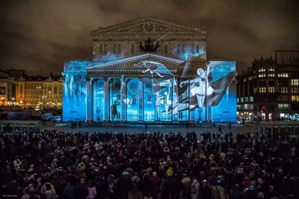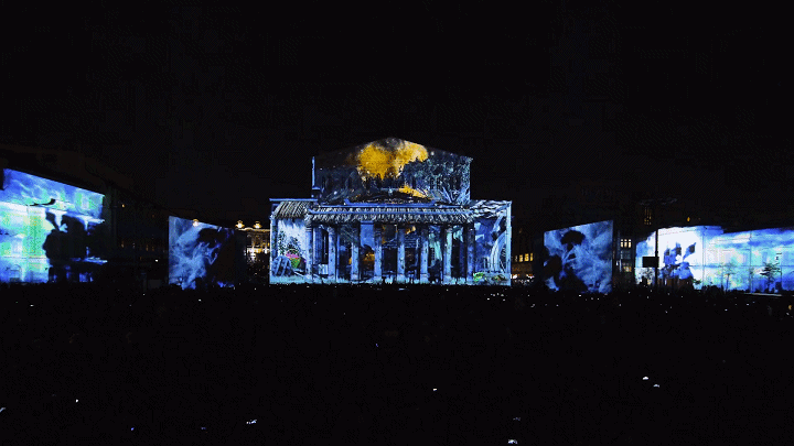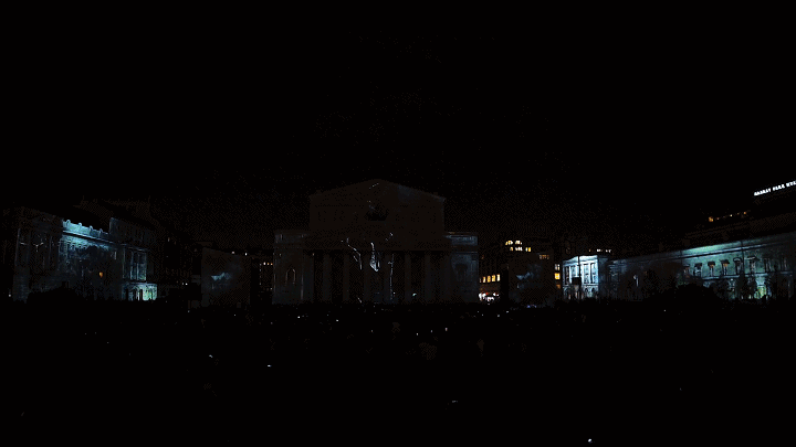 BESTEREO團隊以莫斯科的劇院廣場為中心,將大劇院、瑪麗劇院和青年學術劇院的古典建筑立面統一作為投影舞臺,觀影角度達到270度。