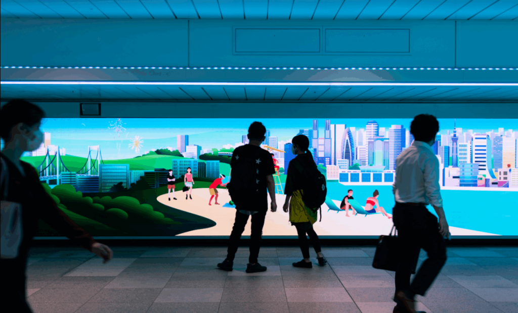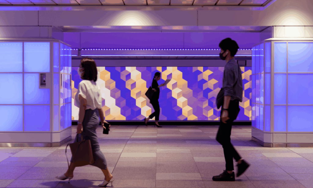 這是Moment Factory和索尼音樂策劃方案公司與東日本鐵路公司合作的項目,在位于東京市中心的新宿站東西通道開發了一個旗艦多媒體數字裝置(The Color Bath)。