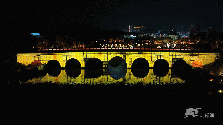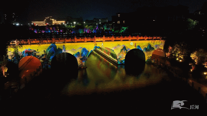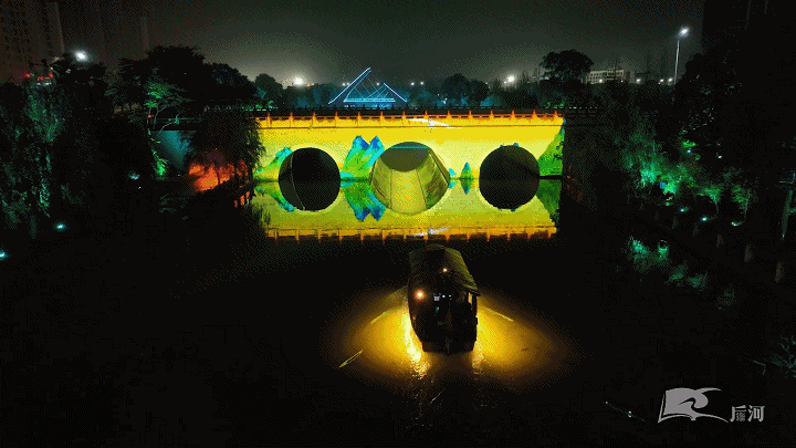 白鷺飛過,亭中燈光亮起。差夫?呼:?鷺報喜,狀元還鄉!通過裸眼3D,?塊塊磚墻與?柱搭建起?座精美的狀元之?。?上掛著?只綢緞繡球,燈籠穿梭而出,顯露出牌坊上狀元?三字,并點亮橋洞及橋上的紅燈籠群。瞬時,橋身、影像、燈光、行舟及周邊環境元素形成完整演出,張燈結彩、鞭炮?鳴、鑼?掀天、喜慶熱鬧;這正是三千進士冠華夏,崇文重教、文風鼎盛的書香廬陵。