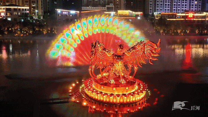 鳳舞廬陵:鳳舞九天,引來百鳥和鳴,百鳥朝鳳;全球首創的鳳凰機甲巨獸,搭配整體設計的水幕、燈光、煙霧,等元素在梧桐舞臺形成一場令人嘆為觀止的鳳舞廬陵機甲水舞燈光演藝秀;梧桐綠萬物生,盛世開鳳凰現。展示新時代吉安再起航、再騰飛的愿景。