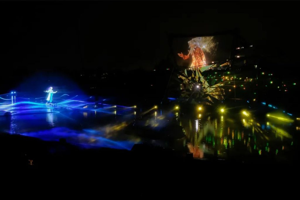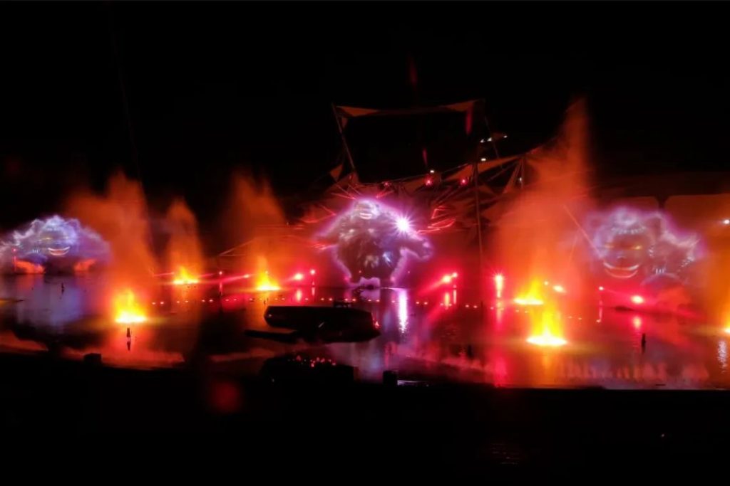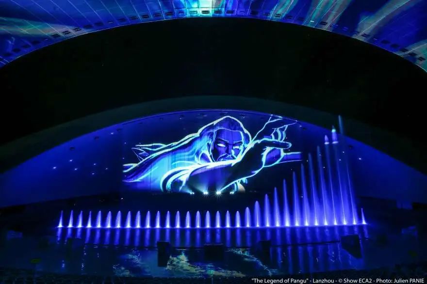 The Legend Of Pangu,旨在將游客帶到中國偏遠地區(qū),延長他們在當?shù)氐穆糜瓮A魰r間,ECA2多媒體數(shù)字藝術(shù)團隊借鑒了一個廣為流傳的傳說,以投影和音頻解說為基礎,并加入激光、燈光、水效、霧、火效和煙火精心打造了一個沉浸式的水幕光影秀奇觀。