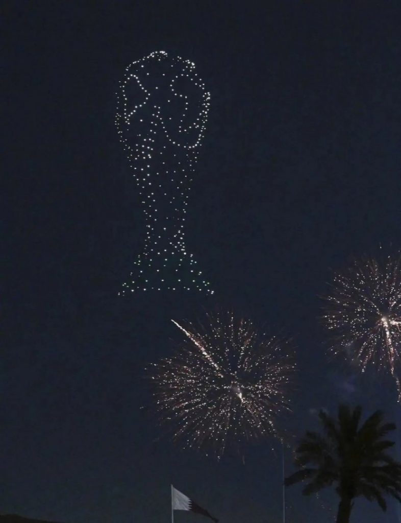 在開幕式前一晚當地時間11月19日晚,國際足聯球迷嘉年華開幕。海濱大道秒變“秀場”,無人機演繹動態燈光秀,球員街頭踢球與球迷友好握手。最壯觀的是,煙花秀搭配無人機表演“卡塔爾歡迎你”。