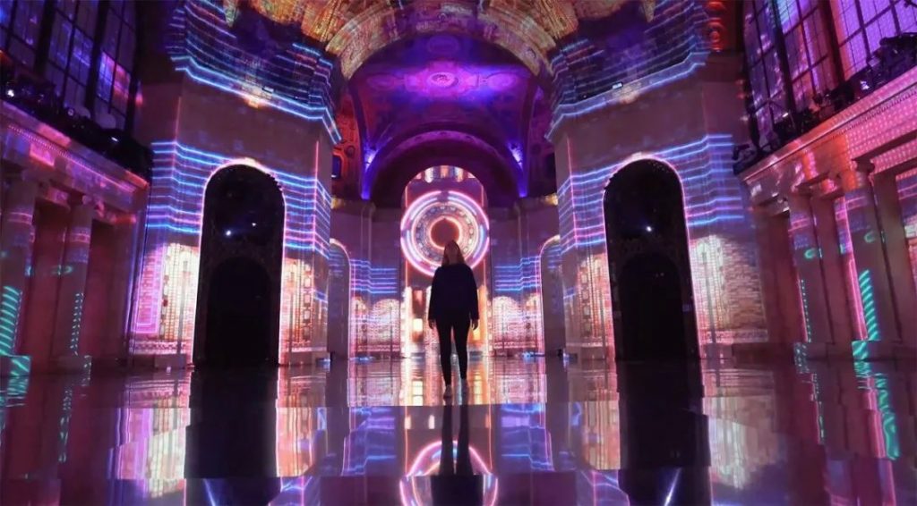 創(chuàng)作團(tuán)隊(duì)通過(guò)360°投影貼圖,交互式視覺(jué)效果,照明,場(chǎng)景設(shè)計(jì)和身臨其境的聲音融合在一起,創(chuàng)造了一種使感官愉悅的體驗(yàn)。為了突出建筑物的雄偉內(nèi)部,該團(tuán)隊(duì)創(chuàng)造了五個(gè)獨(dú)特的環(huán)境,每個(gè)環(huán)境都有獨(dú)特的敘述。