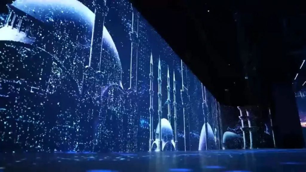 在制作過(guò)程中,團(tuán)隊(duì)以藍(lán)色和黑色背景的拍攝,帶來(lái)超大尺寸的 2D 和3D 動(dòng)畫。其中,數(shù)字投影和LED屏幕覆蓋了所有的地板和墻壁。