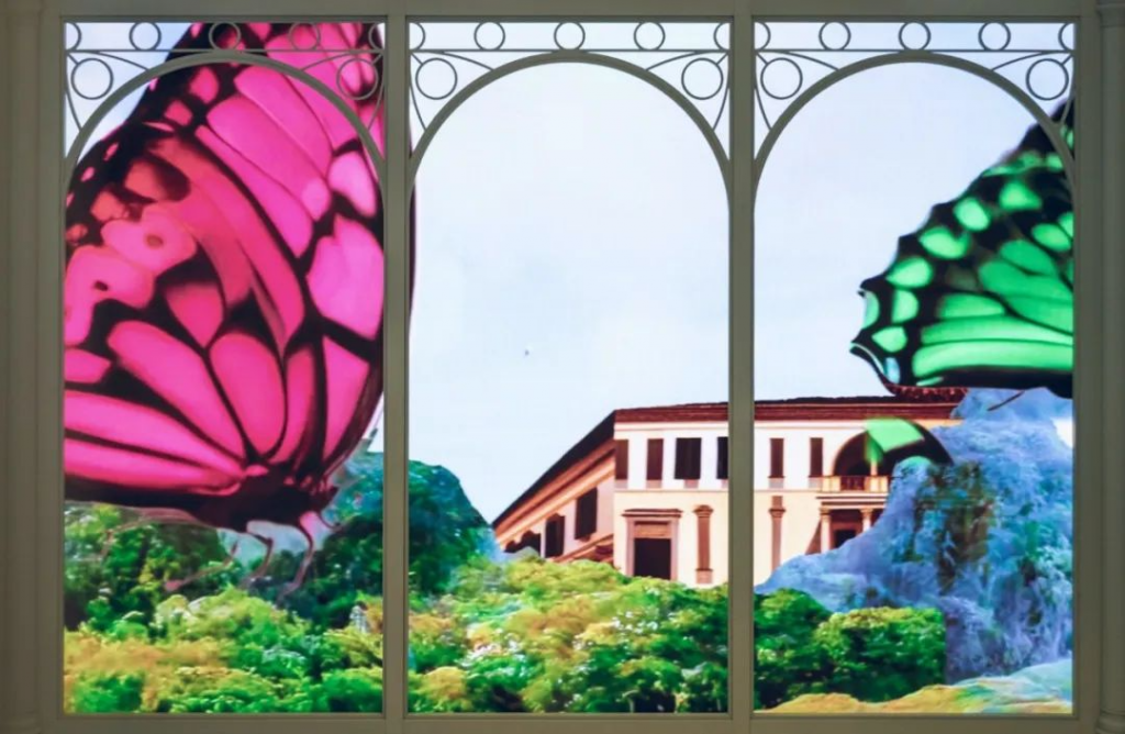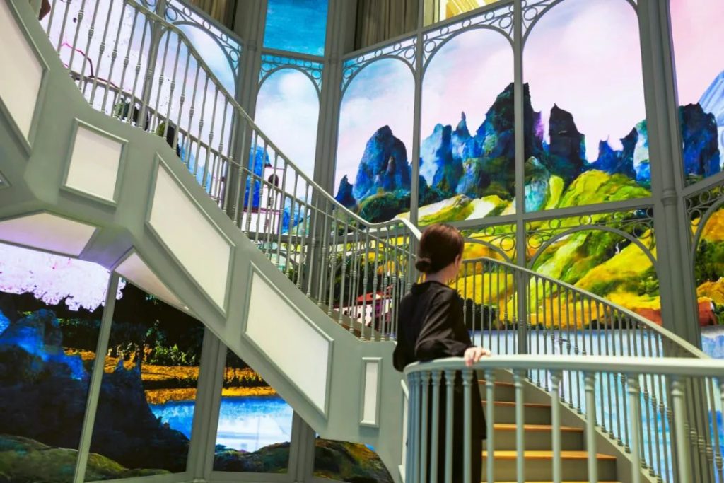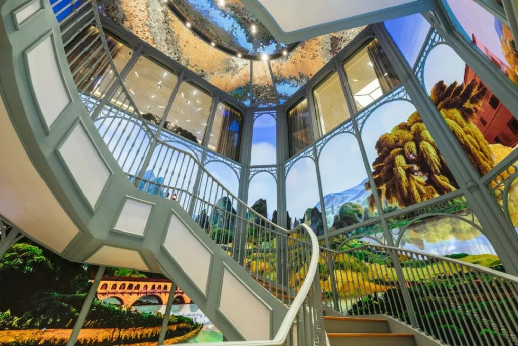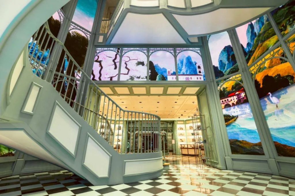 巨幅數(shù)字壁畫橫跨33個(gè)大型LED屏幕,三層樓高的商店墻壁,不斷變化的幻想景觀,融合了中國芙蓉、佛羅倫薩建筑和自然景觀的圖像,一種超越現(xiàn)在,涵蓋過去、傳統(tǒng)、地方和文化,以及繪畫風(fēng)格的數(shù)字美學(xué),完美地反映了 GUCCI 的精髓,沉浸在豐富的歷史中,但始終面向未來。