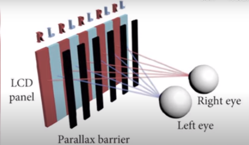 ①視差屏障(PARALLAX BARRIERS):視差屏障和偏振光3D類似,在屏幕上設置寬度只有幾十微米的直條柵欄阻擋光線通過,讓左眼只能看到紅色畫面,右眼只能看到藍色畫面。借此產生立體效果。但同時解析度和亮度都會降低。相關的應用范例就是夏普曾推出過的Sharp SH-12C手機和任天堂的3DS掌機,很多影片也可以看到類似在畫面中加入數條黑線,讓人物或物體運動超過并覆蓋黑線,以達到些許的立體錯覺。