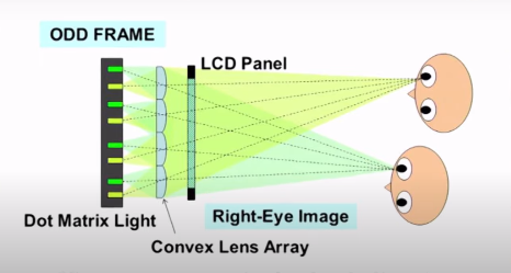 ③指向光源(DERECTIONAL BACKLIGHT):最后一種指向光源技術,就是使用兩組LED高速交替分別朝左右眼投射不同畫面,能夠保持畫面的原始解析度、畫面的亮度也不會降低,但缺點就是不僅設備造價昂貴,還必須讓雙眼維持相同位置以達到最好的立體效果,目前技術也在不斷的開發完善中,隨著科技的不斷進步與發展,期待有更多優秀的設備得以應用到更廣泛領域。