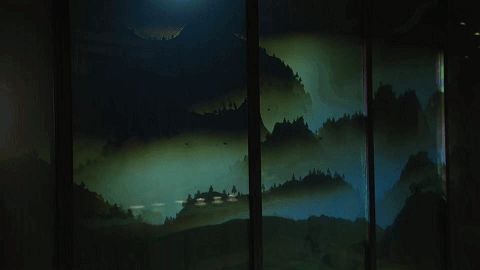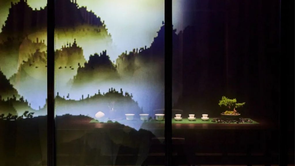 水墨形式的靈感來自亞洲的茶文化傳統,當游客在這個空間內移動時,交互式屏幕會對游客動作做出反應,朦朧煙霧慢慢消散,遠處的山景逐漸顯現。