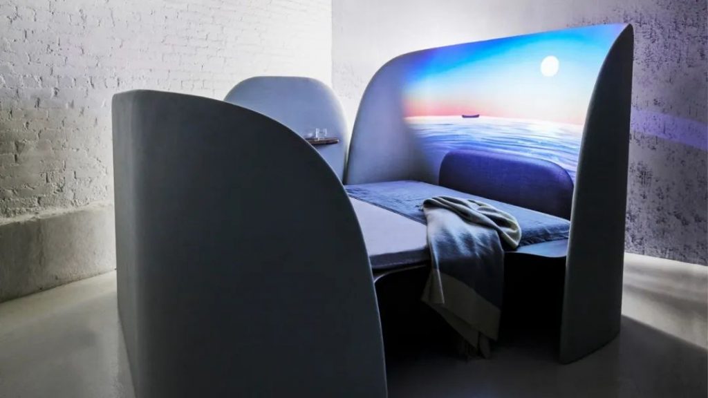 投射在床尾的影像從大自然中汲取靈感,平緩的丘陵,綿延的峻嶺,以及無波的湖水……環繞式音箱播放的自然之聲,像繭一樣包裹著游客,游客能從心感受重擔從肩頭卸下的輕松感,達到身心健康的療愈。