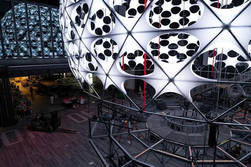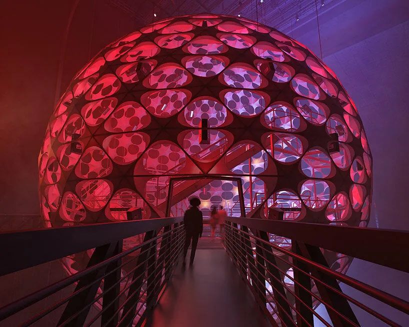 在球體內部,250名觀眾將聚集在特別設計的聆聽平臺上,該平臺高出地面34 英尺,圍繞著中央網絡。“空間化音景”由一百多個揚聲器組成,這些揚聲器將聲音在人們的身體上方、下方穿過和移動,球體表面的動態照明讓這場超真實的多感官之旅更加動感、炫酷。