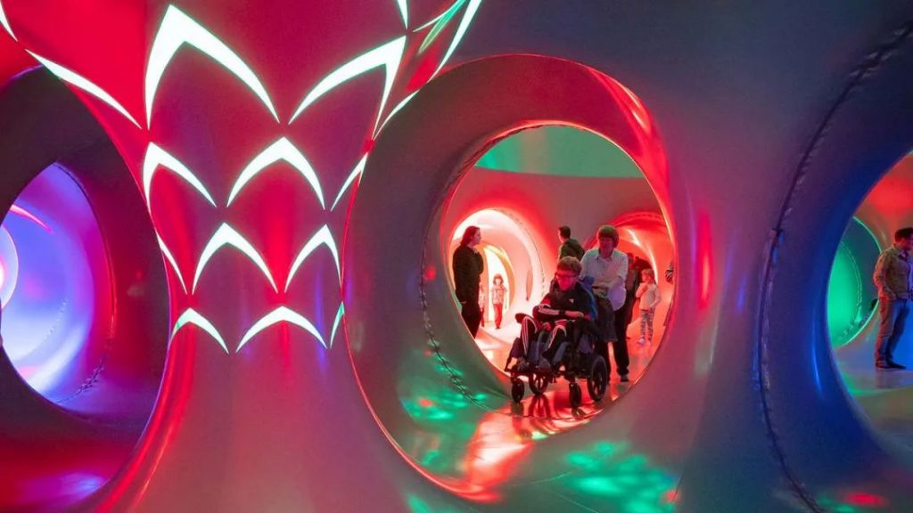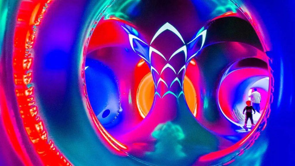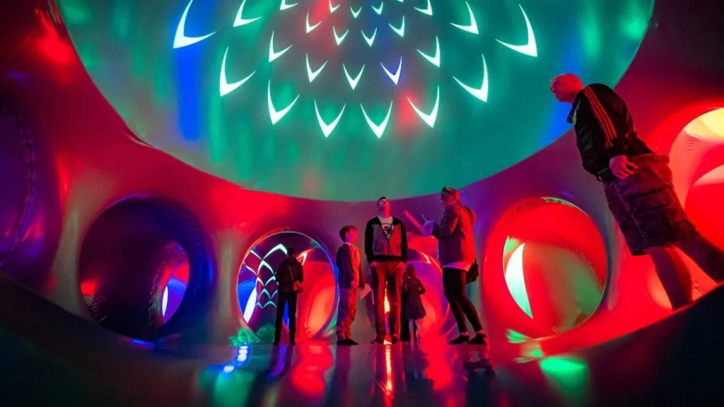 這個充滿活力的裝置構成了一個發(fā)光的充氣結構,一半是跳躍的城堡,一半是迷宮。躲在色彩繽紛的柱子后面,坐在飽和的氣泡狀口袋中,躺下來時,可以凝視曼陀羅般的天花板。