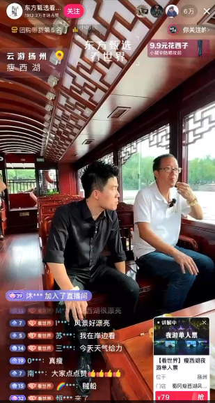 7月29日,由新東方推出的直播帶貨新平臺“東方甄選看世界”專場直播,走進了揚州,走進了廋西湖。新東方教育集團創始人俞敏洪和主播董宇輝在風光秀麗的瘦西湖向全網展現了揚州悠久的歷史文化、瘦西湖風光秀麗的湖上園林,并以親子研學‘夏’揚州”、“園林美景‘賞’揚州”、“二分明月‘夜’揚州”、“淮揚美食‘品’揚州”等維度進行揚州旅游推介。
