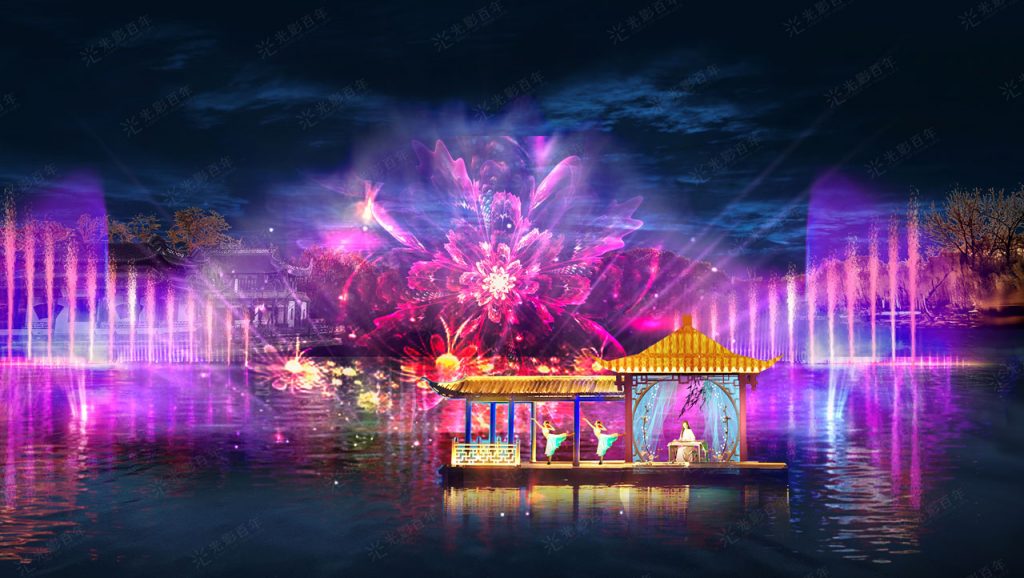 水幕全息秀:結合水幕投影技術,在景區水體中營造“浮空”演出空間,常用于壓軸大秀。
