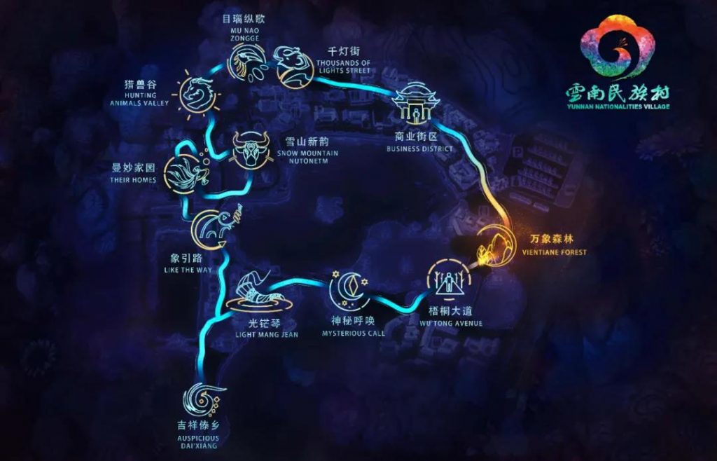 以“夜”為媒,民族圖騰為魂,數(shù)字創(chuàng)意科技加持,貼切展現(xiàn)各民族的獨(dú)有文化特色,更為生動(dòng)地講述云南的多元民族文化和多樣生物特性。同時(shí)激發(fā)民族村夜間市場(chǎng),讓其夜間資源迸發(fā)出新的生命力。