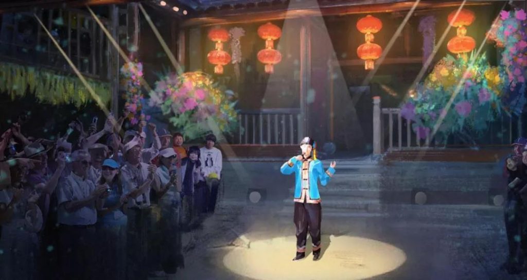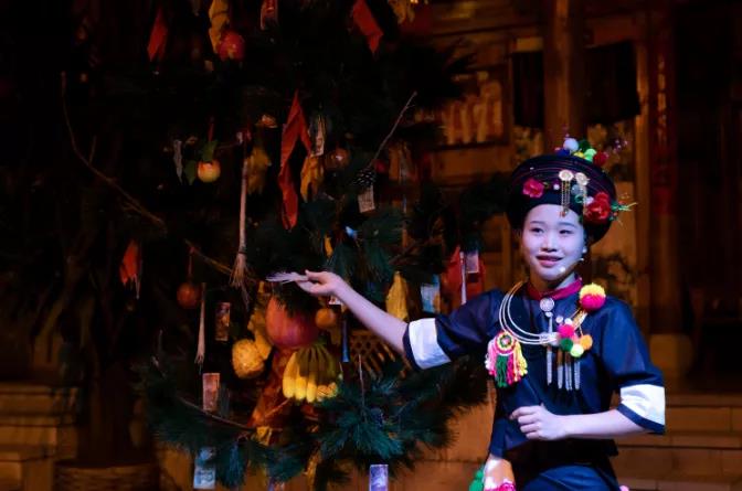 庭院劇為表演形式,展示列入國(guó)家級(jí)非遺保護(hù)名錄的阿昌族戶撒刀文化、祈福文化,婚戀文化等