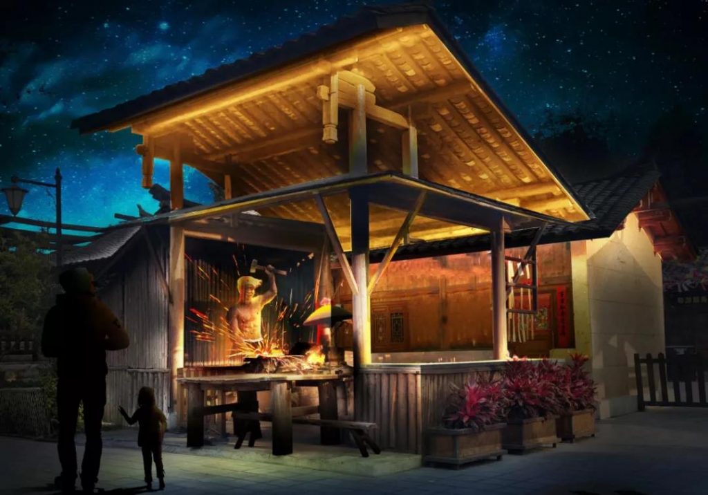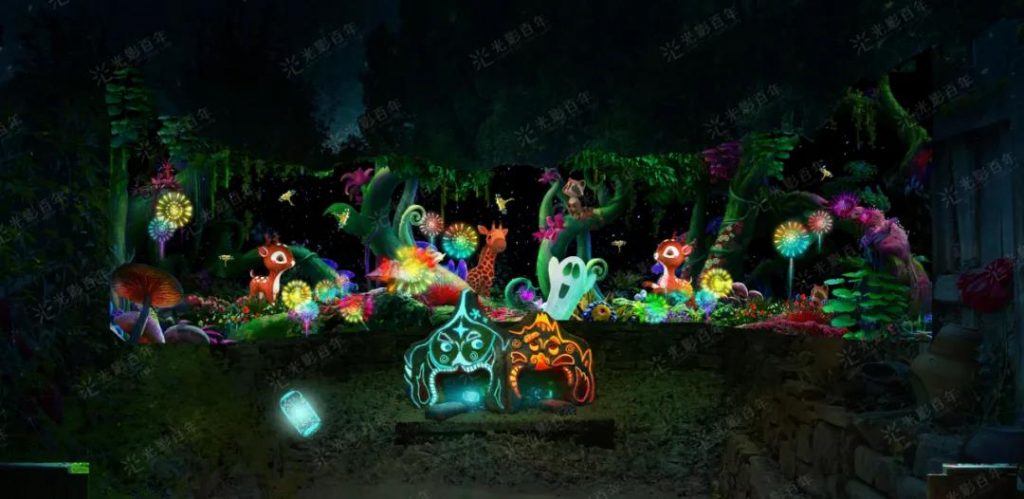 數(shù)字創(chuàng)意團(tuán)隊(duì) 深圳市光影百年科技聯(lián)合北京鈦坦光魔視覺(jué)效果科技,將“再造一座夜間民族村”,打造多元民族文化光影夜游樂(lè)園——《幻火奇妙夜》。