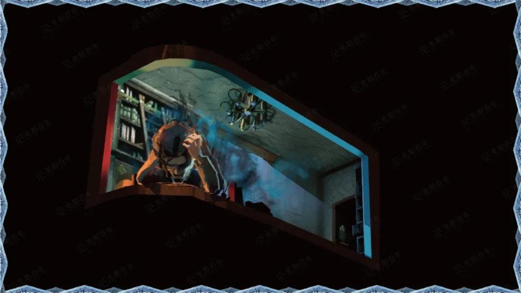 閃爍燭光的房間內充斥著霧氣,偵探仿佛在努力回憶什么,頭痛欲裂的樣子,時不時跳躍一些文字線索和類似破碎記憶的碎片,不停捶打屏幕,每次捶打屏幕都會出現裂縫,映出偵探驚恐失措的表情,玻璃破碎,煙霧籠罩整個場景…