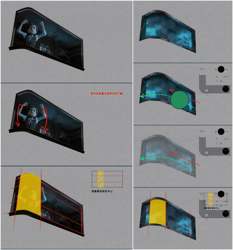 “將故事劇情與曲面屏最佳視角原理相結合,營造場景氣氛,通過角色人物表達情緒,力求將劇情、情緒與氣氛逼真的傳遞給觀眾,帶動觀眾浸入其中。”——美術設計組