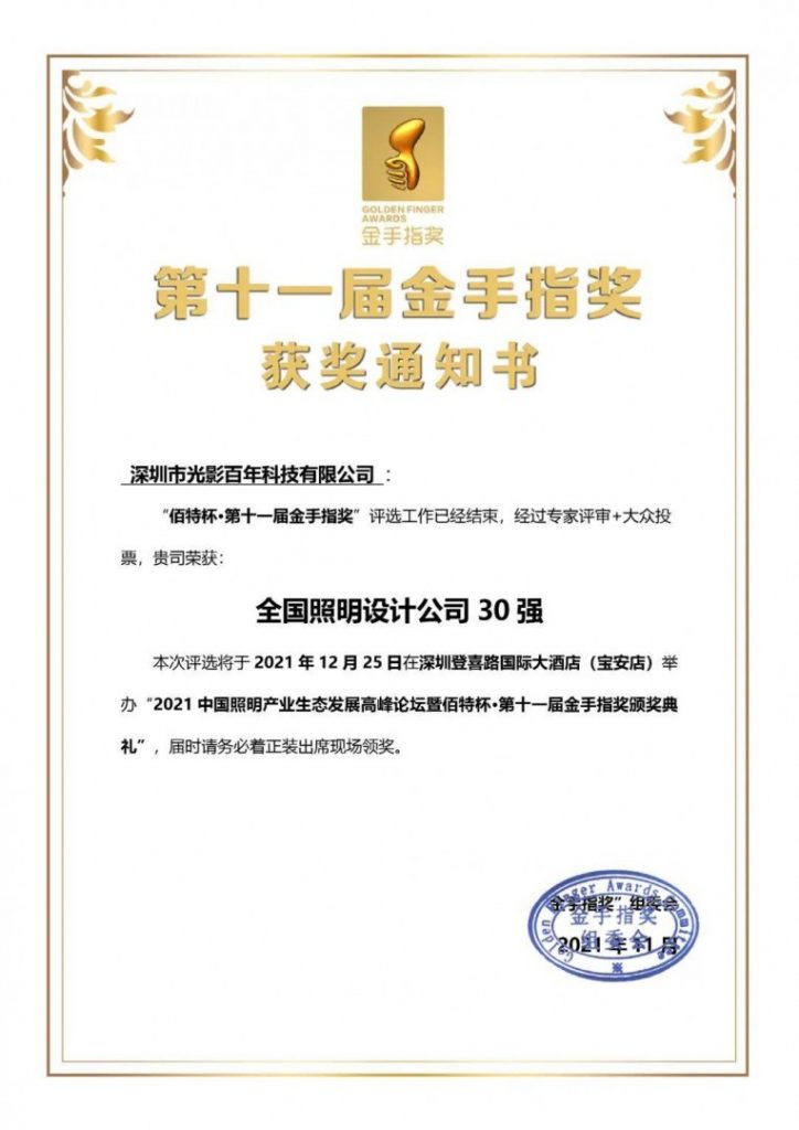 此次光影百年在專業(yè)終審評(píng)委組的推薦下,榮幸入選并通過(guò)公示獲得“全國(guó)照明設(shè)計(jì)公司30強(qiáng)”獎(jiǎng)項(xiàng)。