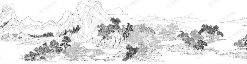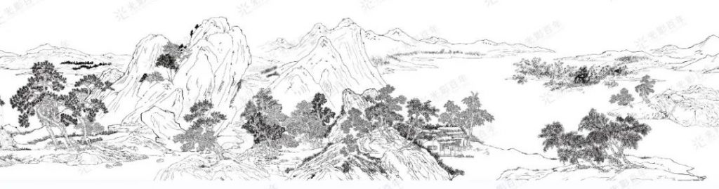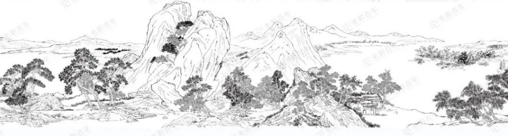 按原畫整體勾線分層,還原古畫的樹葉、山形勾線技法效果、線條的粗細虛實變化;用電腦數字繪畫還原毛筆的技法,需要對線條具有很好的控制能力。