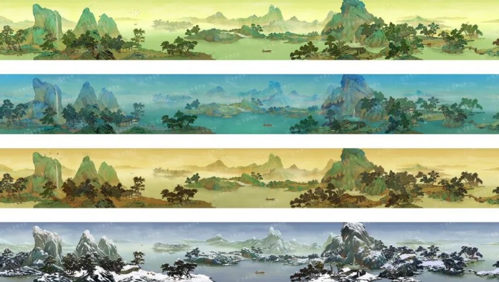 從靜態的畫作變化到動態畫作,設計符合場景意境的特定元素,以及畫面中每棵樹的擺動效果,春天花鳥蝴蝶,夏天雨水荷花魚,秋天樹葉飄落大雁,冬天白雪皚皚炊煙裊裊。每個季節出現的人物、角色及元素都有相應的變化,后期合成細雨、輕霧、雪花以及轉場特效,等。