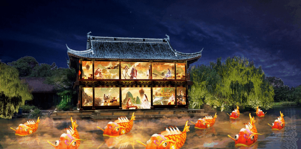 后河·夢回廬陵景區位于贛江之畔,地處吉安市中心城區腹地,通過建筑空間塑造、山水景觀重構、多媒體數字手段植入,打造全域沉浸式、行進式光影夜游體驗。